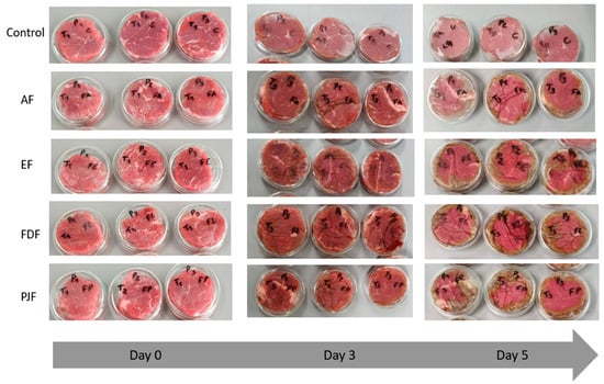 Visual appearance of color meat samples changes during the five days of storage at refrigerated temperature (4 °C). Alginate film with microparticles with encapsulated hydroalcoholic extract (EF), alginate film with pineapple peel juice microparticles (PJF), alginate film with freeze-dried peel powder (FDF), and control films only with alginate (AF).