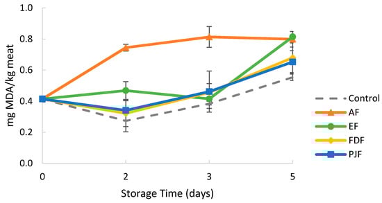2-thiobarbituric acid (TBARS) values of meat samples during five days of storage of meat at 4 °C. The results were expressed as mean malonaldehyde (MDA) concentration in milligram per kilogram of meat. Alginate film with microparticles with encapsulated hydroalcoholic extract (EF), alginate film with pineapple-peel-juice microparticles (PJF), alginate film with freeze-dried peel powder (FDF), and control films only with alginate (AF).