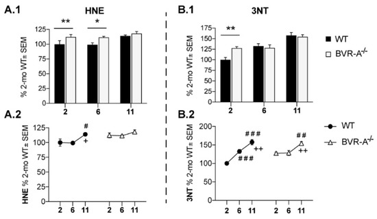 Our data demonstrate an increase of protein-bound HNE adducts both at 2 (+15%, p < 0.05) and 6 months of age (+12%, p < 0.05) in the cortex of BVR-A−/− with respect to WT mice (Figure 1A.1,A.2). Similarly, increased 3-NT levels in BVR-A−/− mice at 2 months (+27%, p < 0.01) were observed (Figure 1B.1,B.2). By evaluating HNE and 3-NT data with respect to age progression (Figure 1B,D) a different effect for aging is evident for WT and BVR-A−/− mice. Indeed, while an increase of HNE and 3-NT levels occurs in WT mice only at an adult/old age, BVR-A−/− mice show elevated markers of proteins oxidation starting at 2 months (Figure 1A.2,B.2). Accordingly, 2-way ANOVA analysis supports the effect of age for both HNE and 3-NT changes (F (2, 18) = 5.18, p < 0.05 and F (2, 18) = 28.70, p < 0.0001, respectively) and age × genotype interaction for 3-NT (F (2, 18) = 5.14, p < 0.05) (Table 1). These data suggest that BVR-A might play a crucial role in the protection from oxidatively-damaged proteins accumulation, in agreement with [20].