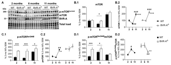 To determine whether the early increase of oxidatively-damaged proteins in BVR-A−/− mice is associated with the mTOR/autophagy axis impairment, we evaluated the activation state of mTOR complex. In fact, mTOR is a core component of the multiprotein complex mTORC1, through which it acts to inhibit autophagic induction [48]. Sustained mTOR activation (indexed by Ser2448 phosphorylation) is well-known to mediate the drop of autophagy function by interacting with components of the autophagosome formation process [34,35]. In our experimental setting, mTOR protein levels did not show any significant differences between WT and BVR-A−/− mice except for a significant increase observed at 6 months in BVR-A−/− mice with respect to WT (+45%, p < 0.05) (Figure 2B.1). Significant changes for mTOR protein levels with aging are evident in both the two groups (Figure 2B.2). When we evaluated the active form (p-mTORSer2448), we found significantly elevated levels in BVR-A−/− with respect to WT mice for each age considered for the study (+187%, p < 0.001 at 2 months, +208%, p < 0.001 at 6 months and +94%, p < 0.05 at 11 months) (Figure 2C.1). As observed for protein oxidation, mTOR phosphorylation levels increase early in life in BVR-A−/− mice with respect to WT (Figure 2C.1,C.2) suggesting a differential aging process between the two groups of comparison. Finally, we analyzed the active form per total protein levels ratio (p-mTORSer2448/mTOR) as an index of mTOR activation process in each subgroup. Our results show that p-mTORSer2448/mTOR ratio is significantly increased in BVR-A−/− mice with respect to WT both at 2 (+177%, p < 0.001) and 6 months (+83%, p < 0.05) (Figure 2D.1). In addition, age-associated changes of p-mTORSer2448/mTOR ratio progress with a different profile in BVR-A−/− compared WT mice (Figure 2D.2). Consistently with the above data, 2-way ANOVA analysis demonstrates that both age and genotype largely influence changes of mTOR protein levels (age: F (2, 18) = 45.89, p < 0.0001; genotype: F (1, 18) = 5.33 p < 0.05) and mTOR phosphorylation (age: F (2, 18) = 10.53, p < 0.001; genotype: F (1, 18) = 40.78, p < 0.0001) (Table 1). Together, these observations suggest that loss of BVR-A promotes the hyper-activation of mTOR.