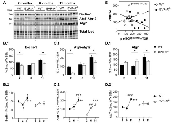 Reduced autophagosome nucleation occurs in the cerebral cortex of BVR-A−/− mice. Representative western blot images (A) and densitometric evaluation of Beclin-1(B.1,B.2), Atg5–Atg12 complex (C.1,C.2) and Atg7 (D.1,D.2) levels in the cerebral cortex of WT and BVR-A−/− mice at 2 (n = 4), 6 (n = 4) and 11 (n = 4) months of age. Protein levels were normalized per total protein load. Data are expressed as percentage of WT mice at 2 months set as 100%. Columns were used to show differences among the groups (WT vs. BVR-A−/−) while dots to show age-associated changes within each group. Data are expressed as Mean ± SEM. For columns: * p < 0.05, ** p < 0.01 vs. WT (2-way ANOVA with Fisher’s LSD test). For dots: # p < 0.05, ### p < 0.001 vs. 2 months; ++ p < 0.01, +++ p < 0.001 vs. 6 months (2-way ANOVA with Fisher’s LSD test). (E) Pearson correlation between Atg5–Atg12 and p-mTORSer2448/mTOR ratio in WT and BVR-A−/− mice.