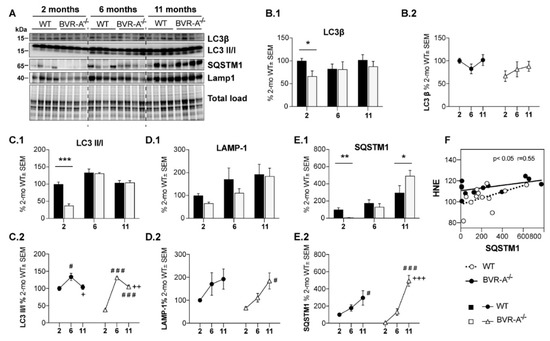 Finally, we analyzed SQSTM1 protein levels, a well-established marker of autophagic degradation efficiency. SQSTM1 is a multidomain protein that drives ubiquitinated substrates to lysosomal degradation during selective autophagy. Since SQSTM1 itself is degraded by autolysosomes, its measurement serves as an indirect evaluation of autophagic efficiency with its protein levels being inversely correlated with autophagic degradation [52]. SQSTM1 protein levels are strongly reduced at 2 months (−92%; p < 0.01) but consistently increased at 11 months (+246%, p < 0.05) in BVR-A−/− mice compared to WT mice (Figure 4E.1). Changes within each group appear to progress with the same profile during aging, although a more pronounced elevation of SQSTM1 protein levels occur in BVR-A−/− mice (Figure 4E.2). Indeed, 2-way ANOVA analysis reveals a major role for age (F (2, 18) = 25.27, p < 0.0001) and age x genotype interaction (F (2, 18) = 5.022, p < 0.001) Table 1). In addition, increased SQSTM1 protein levels are positively associated with HNE levels only in BVR-A−/− but not in WT mice (Figure 4F), thus suggesting that degradation of damaged proteins through autophagy could be compromised in the absence of BVR-A.