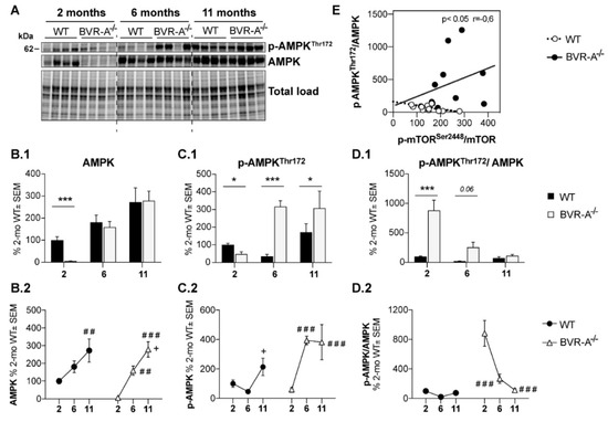 Reduced AMPK levels and activation in the cerebral cortex of BVR-A−/− mice. Representative western blot images (A) and densitometric evaluation of AMPK (B.1,B.2), p-AMPKThr172 (C.1,C.2) and p-AMPKThr172/AMPK ratio (D.1,D.2) in the cerebral cortex of WT and BVR-A−/− mice at 2 (n = 4), 6 (n = 4) and 11 (n = 4) months of age. Protein levels were normalized per total protein load. Data are expressed as percentage of WT mice at 2 months set as 100%. Columns were used to show differences among the groups (WT vs. BVR-A−/−) while dots to show age-associated changes within each group. Data are expressed as Mean ± SEM. For columns: * p < 0.05, *** p < 0.001 vs. WT (2-way ANOVA with Fisher’s LSD test). For dots: ## p < 0.01, ### p < 0.001 vs. 2 months; + p < 0.05 vs. 6 months (2-way ANOVA with Fisher’s LSD test). (E) Pearson correlation between p-AMPKThr172/AMPK ratio and p-mTORSer2448/mTOR ratio in WT and BVR-A−/− mice.