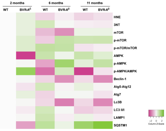 Besides the antioxidant role for BVR-A, a striking finding of our study concerns the molecular link between BVR-A and mTOR and the potential regulatory role for BVR-A towards the mTOR/autophagy pathway. Our results demonstrate that mTOR becomes hyper-active in mice lacking BVR-A, as result of mTOR increased activation process (p-mTORSer2448/mTOR), particularly at 2 and 6 months (Figure 2D.1). Instead, higher p-mTORSer2448 levels in 11 months old animals result from increased mTOR protein levels. Notwithstanding, both cases end up with mTOR hyper-activation supporting the notion that BVR-A could regulate mTOR, as it does with other proteins [1]. Interestingly, in a previous report, Bisht and colleagues showed that high doses of biliverdin (the substrate of BVR-A) promote the activation of the mTOR pathway, while rapamycin (a well-known mTOR inhibitor) prevents biliverdin-mediated effects [71]. Since biliverdin is not known to regulate mTOR catalytic domain or expression levels but it is known to inhibit BVR-A expression at high concentrations [72], its effect on mTOR activation could be mediated by the down-regulation of BVR-A protein levels. This hypothesis is in agreement with studies from our group showing that reduced BVR-A levels or dysfunctional BVR-A are both events associated with the hyper-activation of mTOR in the brain [12,19,23]. In addition, we previously showed that increased oxidative/nitrosative stress levels, mediated by administration of peroxynitrate or H2O2 to neuroblastoma cells, lead to reduced BVR-A protein levels along with mTOR hyper-activation [12,19], as observed in BVR-A−/− mice.