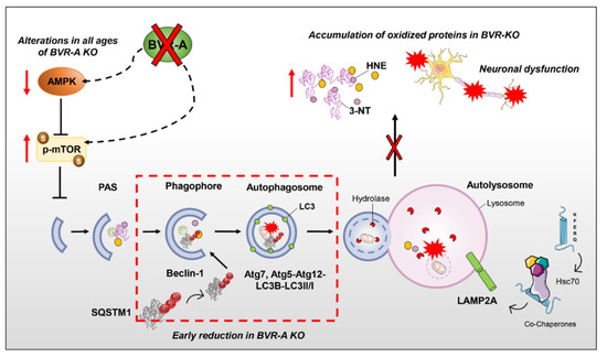 In the present study, we provide further evidence on the molecular mechanisms that link alternations to BVR-A and oxidative protein damage in the brain by focusing on the role of mTOR/autophagy axis. Indeed, our results suggest that loss of BVR-A promotes the hyper-activation of mTOR, which triggers the reduction of autophagy, thus contributing to the accumulation of oxidized proteins in the brain. Such aberrant regulation of protein homeostasis is evident early in the juvenile period (2 months) and persist both in the adult (6 months) and in aged (11 months) BVR-A−/− mice (Figure 6). Intriguingly, we identified the impairment of AMPK as possible cause of mTOR-hyper-activation, thus proposing the existence of a regulatory axis formed by BVR-A/AMPK/mTOR.