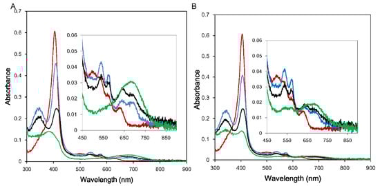 The heme–rHO-1 complex was reconstituted with 1.2 equiv. of heme and purified by column chromatography on a hydroxyapatite column (Bio-Rad), as previously described []. The concentration of heme–rHO-1 was determined by measuring the absorbance at 406 nm (ε = 140 mM−1 cm−1) (pH 7.4). Rat biliverdin reductase used for the enzymatic assay was expressed in E. coli and purified by ammonium sulfate fractionation, affinity chromatography (2′,5′-ADP Sepharose), and size-exclusion chromatography (Sephacryl S-200 HR (GE Healthcare)) [,].