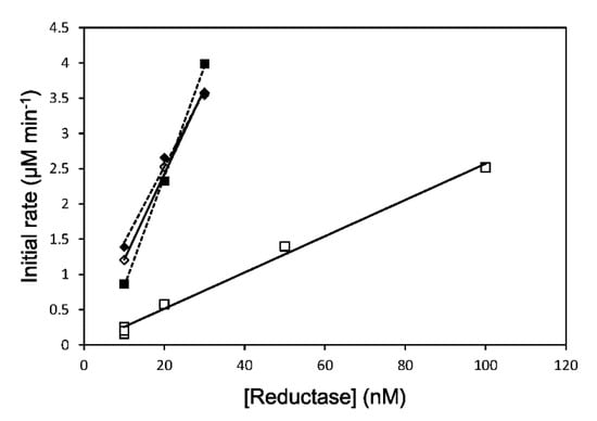 HO-1 activity. Bilirubin formation rates obtained in the NADPH–rCPR and NADPH–147CC514 systems were plotted as blank diamonds and squares, respectively. A representative example of the multiple measurements performed is displayed. See Methods for details.