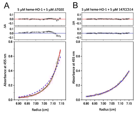 Sedimentation equilibrium analysis for heterodimer formation between heme–rHO-1 and ΔTGEE (A) or 147CC514 (B). The concentration of each protein was 5 μM. Absorbance data were collected at 15,000 rpm in a Beckman XL-A analytical ultracentrifuge. The data points fit to the complex (red lines) and non-complexed (blue dashed lines) models. The Kd value of ΔTGEE for heme–rHO-1 was estimated to be 0.178 ± 0.077 μM. Residual fitting is depicted above both curve fits, with the complex model indicated in red, and the non-complexed model in blue.