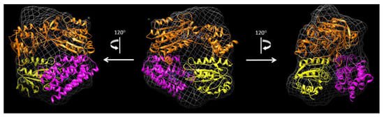 We could successfully observe single particles of the rCPR–heme–rHO-1 complex using cryo-EM. Figure 5 compares a cryo-electron microscopic image and the X-ray structure of the ΔTGEE–heme–HO-1 complex (PDB ID: 3WKT) []. The surface structure of rCPR–heme–rHO-1 (illustrated as a gray net in Figure 5) was consistent with the X-ray structure of the ΔTGEE–heme–HO-1 complex (ribbon diagrams in Figure 5), which confirmed that the X-ray structure represents the complex structure of rCPR–heme–HO-1 in aqueous solution.