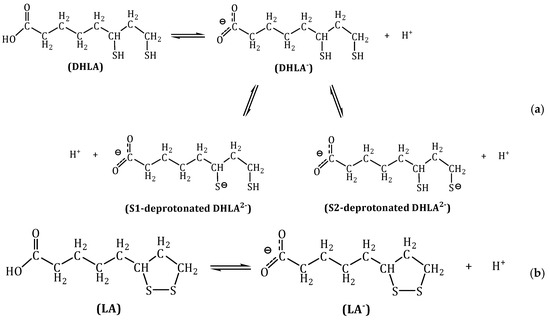 Acid-base equilibria involving dihydrolipoic (DHLA, (a)) and lipoic (LA, (b)) acids.