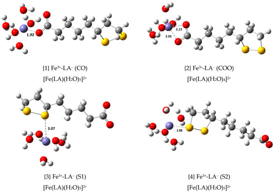 Optimized geometries of the 1:1 complexes of Fe(III) with lipoic acid, LA− (bond distances in Å).