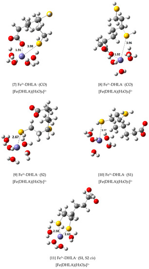 Seven Fe(III) complexes with DHLA− were optimized. Their structures, with relevant bond distances indicated, are displayed in Figure 3. Table 2 contains their , and values as per the complex formation equilibrium shown in Equation (5). Four of these complexes are exergonic. The two most stable complexes also have DHLA− coordinating via CO (monodentate), {5}, and COO (bidentate), {6}. These are 2–3 kcal/mol less stable than their LA- counterparts, complexes {1} and {2}, respectively. However, their coordinating bond distances to Fe(III) are very similar to the ones found with LA− (see Figure 2). Similar observations can be made on these last two points when inspecting the Cu(II) complexes with LA− and DHLA− [10]. The other two exergonic Fe(III) complexes with DHLA−, {7} and {8}, seem to be penta-coordinated. Both contain CO coordination from DHLA− and each of the sulfur atoms are nearby, but too far away (3.96–3.98 Å) from the central ion to coordinate to it. These complexes are 1.3–2.0 kcal/mol less stable than the equivalent octahedral complex {5}. Coordination via S1 and S2 led to complex {11}, which is less stable than when only S2 or S1 coordinates to the central ion, {9} and {10}. These three complexes, {9}, {10} and {11} are endergonic. Complex {11}, the least stable of all, seems to be too strained and entropically unfavourable; it exhibits the shortest Fe(III)-S coordinating distances (2.58 and 2.63 Å) when compared to other LA− and DHLA− complexes.