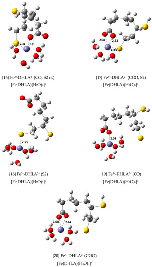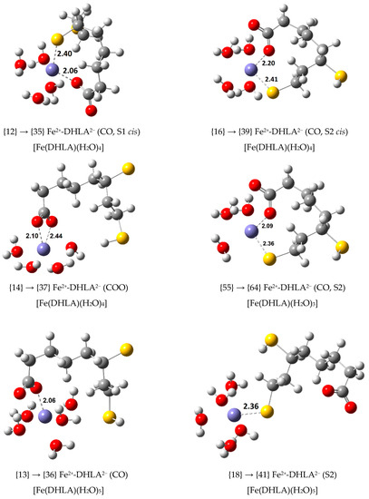 Since Fe(III) is also known to form non-octahedral complexes, tetra- and penta-coordinated complexes were optimized from the most stable octahedral complexes with LA− and DHLA2−, complexes {1}, {2}, {12}, {16} and {17}. Nine new exergonic Fe(III) complexes were optimized. Their , and values are displayed in Table 4, and their structures are shown in Figure 6 and Figure 7.