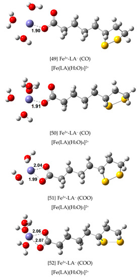 Four Fe(III) complexes with LA− were calculated. Their , and values are displayed in Table 1, following the equilibrium indicated in Equation (4), and their structures are shown in Figure 2. In this equilibrium, and in others that will be presented in the following sections, (6 − n)H2O identifies an optimized cluster of no more than five water molecules. In the present study, clusters with up to five water molecules were calculated.