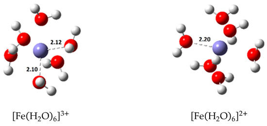 Since the ions Fe(III) and are solvated in water, a hydrated octahedral complex is a more realistic representation of these species. The most stable hydrated complexes calculated are shown in Figure 8. Therefore, the actual reference reactions considered for the kinetic study of the first step of the Haber–Weiss cycle are shown in Equations (10) and (11).