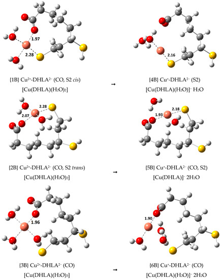 To compare the secondary antioxidant activity of LA and DHLA with respect to the Cu(II)/Cu(I) and Fe(III)/Fe(II) reductions, some of the calculations previously reported in Reference 10 for the Cu(II) complexes at the M06-2X(SMD)/6-31++G(d,p) level of theory have been re-done using the M06 functional. The three most stable Cu(II) complexes (previously reported as complexes {23}, {24} and {25} in Reference 10; now labelled {1B}, {2B} and {3B}), all with the S2-deprotonated DHLA2− ligand, were re-optimized and their corresponding linear Cu(I) complexes (labelled {4B}, {5B} and {6B}) were calculated. Reference 10 only reports the Cu(I) complex related to complex {1B}. The new M06 structures are shown in Figure 10.