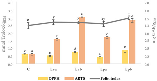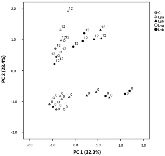 Lpb. C: sodium ascorbate control; Lva: 2.5% “verdejo” lees; Lvb: 5% “verdejo” lees; Lpa: 2.5% “palomino” lees; Lpb: 5% “palomino” lees.