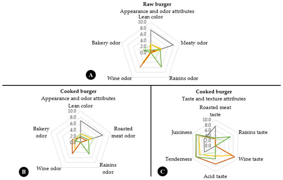 Lpb. C: sodium ascorbate control; Lva: 2.5% “verdejo” lees; Lvb: 5% “verdejo” lees; Lpa: 2.5% “palomino” lees; Lpb: 5% “palomino” lees. (A) Raw burgers: Appearance and odor attributes; (B) Cooked burgers: Appearance and odor attributes; (C) Cooked burgers: Taste and texture attributes.