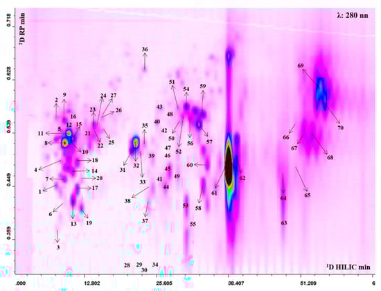 - Sommella, E.; Ismail, O.H.; Pagano, F.; Pepe, G.; Ostacolo, C.; Mazzoccanti, G.; Russo, M.; Novellino, E.; Gasparrini, F.; Campiglia, P. Development of an improved online comprehensive hydrophilic interaction chromatography × reversed-phase ultra-high-pressure liquid chromatography platform for complex multiclass polyphenolic sample analysis. J. Sep. Sci. 2017, 40, 2188–2197. [Google Scholar] [CrossRef] [PubMed]