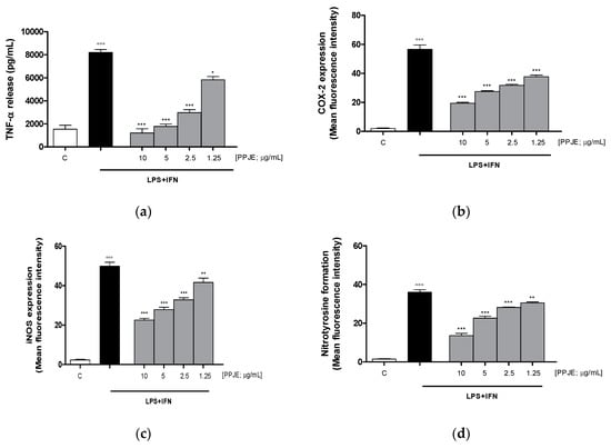 3.2.2. Pomegranate Reduced TNF-α Levels, COX-2 and iNOS Expression, and Nitrotyrosine Formation in LPS + IFN-Stimulated IEC-6