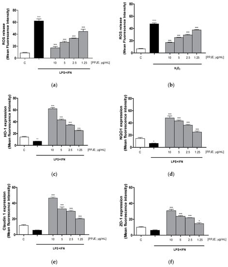 2.4.5. Evaluation of COX-2, iNOS, HO-1, NQO1, Bax, Bcl-2, Bcl-xL, Caspase 3, Claudin 1, Occludin, ZO-1, E-cadherin Expression and Nitrotyrosine Formation by Cytofluorimetry