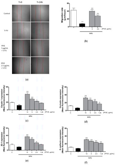 3.3.4. Pomegranate Juice Promoted Wound Repair and Adhesion Proteins Expression in 5-FU-Treated IEC-6