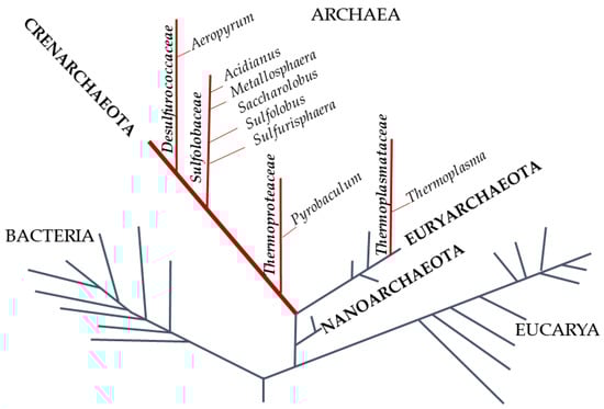Phylogenetic tree of life. The red lines represent the hyperthermophilic aerobic archaea. In capitals, in bold italics, and in italics are phylum, family, and genus of the Archaea, respectively.