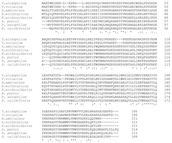 SOD sequence alignment by Clustal Omega. Thermoplasma acidophilum, Thermoplasma volcanium, Acidianus amibivalens, Saccharolobus solfataricus, Sulfolobus acidocaldarius, Aeropyrum pernix, Pyrobaculum aerophilum, and Pyrobaculum calidifontis.