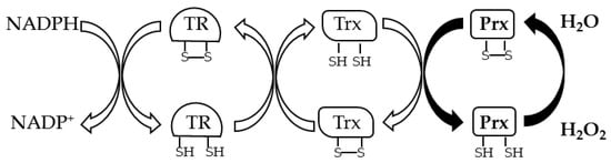 Prxs (EC 1.11.1.15) are thiol peroxidases that are characterized by a Trx fold in which one or two cysteine residues play a key role in the reduction of inorganic and organic peroxides [5]. These enzymes are classified in 1-Cys Prxs and 2-Cys Prxs based on the number of cysteine residues involved in the catalysis. 1-Cys Prxs have only one Cys residue located at the N-terminus of the protein, the peroxidatic cysteine (CP), which is oxidized to sulfenic acid in the presence of peroxide. The regeneration of the enzyme in the reduced active state is generally due to GSH or other disulfide reducing systems. 2-Cys Prxs can be divided into atypical 2-Cys Prxs and typical 2-Cys Prxs based respectively on the formation of an intramolecular or intermolecular disulfide bond between CP and the resolving cysteine (CR), which is the other catalytic residue. In atypical 2-Cys Prxs, the CR is located at the N-terminus, 10–15 aa from CP, or at the C-terminus. In both cases an intramolecular disulfide bond is formed after the oxidation of CP. In contrast, in the typical 2-Cys Prxs, the CP at the N-terminus and CR at the C-terminus belong to different subunits and condense to form an inter-subunit disulfide bond; in fact, the 2-Cys Prxs have a complex quaternary structure as the hexadecameric structure described in A. pernix [63]. In both cases a disulfide reductase system recycles Prxs; generally, an electron cascade starting from NADPH through TR and Trx reduces the disulfide bond of Prx (Figure 3).