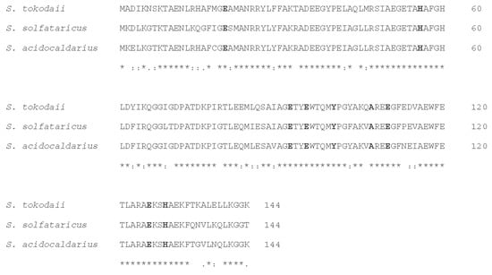 Sequence alignment of Sulerythrin by Clustal Omega among S. tokodai, S. solfataricus, and S. acidocaldarius. Conserved residues that are related to di-iron center binding are in bold.