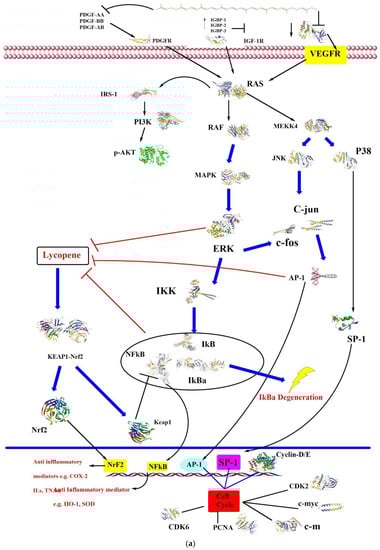 (a). Effect of lycopene on PDGFR-, IGF-IR-, and VEGFR-mediated signal pathways. (b) Effect of Lycopene on Reactive Oxygen Species (modified from []).