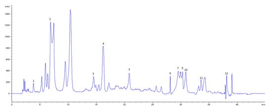 HPLC chromatogram of Soxhlet (SOX) leaf extract of Vitis vinifera cv. Aglianico (320 nm). Peaks: 1, gallic acid; 2, caftaric acid; 3, (+)-catechin; 4, caffeic acid; 5, benzoic acid; 6, rutin; 7, quercetin-3-O-galactoside; 8, quercetin-3-O-glucoside; 9, quercetin -3-O-glucuronide; 10, quercetin-3-O-glycoside; 11, kaempferol-3-O-glucoside; 12, quercetin.