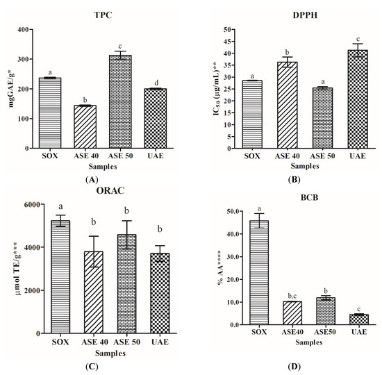 Samples are extracts obtained by Soxhlet extractive technique (SOX), Accelerated Solvent Extraction at 40 °C (ASE 40), Accelerated Solvent Extraction at 50 °C (ASE 50) and Ultrasound-assisted extraction (UAE). Histograms of (A) Total Phenolic Content (TPC); (B) DPPH method; (C) Oxygen Radical Antioxidant Capacity (ORAC) assay; (D) β-Carotene Bleaching assay (BCB); data are expressed as means ± standard deviation from three experiments; * mg GAE/g = mg of Gallic Acid Equivalents per gram of dried sample; ** IC50 (μg/mL) = concentration of the sample able to scavenge 50% DPPH radical; *** µmol TE/g = µmol of Trolox Equivalents per gram of dried sample; **** % AA = percentage of Antioxidant Activity at final sample concentration of 0.2 mg/mL; different superscripts in the same row indicate significant difference (p < 0.05).