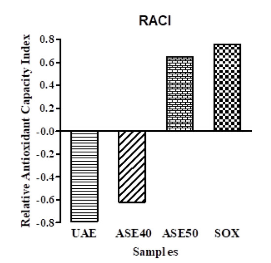 A new concept, Relative Antioxidant Capacity Index (RACI), was applied, integrating antioxidant capacity data determined by several methods [42]. To compare the antioxidant capacity of extracts derived from different chemical methods, results of TPC, DPPH, ORAC and BCB were used to calculate the RACI. Data of relative antioxidant activity were represented in Figure 3. According to obtained results, the leaf extract obtained by Soxhlet technique showed the highest RACI value of 0.76, followed by ASE 50 (0.65).