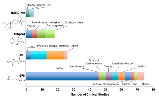 Summaries of the clinical development and utilization of DMF, BARD-Me, oltipraz, and SFN are provided in the following sections, along with highlights of general evidence for the targeting of NRF2 by these agents based on preclinical studies. Interestingly, the clinical applications of each drug are quite distinct. The distributions of healthy and disease-state study populations enrolled in clinical trials with these four agents are highlighted in Figure 1.