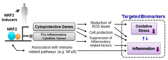 Nrf2 activation by the triterpenoid (CDDO-Im) induces a series of antioxidant genes, accompanied by suppressed expression of inflammatory-related genes, such as TNF- α, IL-6, MCP-1 (monocyte chemo attractant protein-1), and MIP2 (macrophage inflammatory protein-2) in LPS-stimulated mouse peritoneal macrophages, as well as LPS-treated mice (in which anti-inflammatory effects did not occur in Nrf2-deficient cells and mice) [218]. In mouse peritoneal macrophages stimulated by prostaglandin, Nrf2 induces Hmox1 and peroxiredoxin 1 (Prx-1) gene expression, which appears to inhibit inflammatory-related gene expression [219]. Interestingly, human PRX-1 is reported to negatively regulate macrophage migration inhibitory factor (MIF) [220], a crucial factor in the regulation of inflammation. Accordingly, MIF activity was measured in human urine samples after SFN administration to investigate the possibility for MIF as a biomarker to assess anti-inflammatory efficacy in interventions [142]. SFN seems to affect multiple downstream pathways associated with anti-inflammatory actions and NRF2 signaling may be but one pivotal pathway. Pretreatment of primary peritoneal macrophages by SFN inhibits inflammatory-related gene expression, including Cox-2 and iNOS, which was attenuated in Nrf2-deficient cells [221]. The suppression of COX-2 expression in PBMCs was indicated in a clinical study, where the treatment response by SFN for autism spectrum disorder patients was examined [195]. The association between Keap1-Nrf2 signaling and the nuclear factor-κB (NF-κB) signaling pathway, one of the essential immune-related pathways, is another potential mechanism underlying anti-inflammatory effects by Nrf2 activation [222,223,224]. Nrf2 and NF-κB individually affect other signaling cascades, in addition to crosstalk between two pathways. The absence of Nrf2 amplifies NF-κB activity, suggesting an inhibitory action of Nrf2 toward NF-κB [225], whereas NF-κB can modulate Nrf2 transcriptional activity [226]. Understanding the molecular links between these two signaling pathways may lead to more informative biomarkers. Intracellular NF-κB signaling molecules have been examined to evaluate responses for inflammatory disease in clinical studies using DMF and BARD-Me [50,66]. Other molecular mechanisms behind Nrf2-mediated anti-inflammatory effects have been described, such as transcriptional suppression of proinflammatory cytokine genes (Il-6 and Il-1β) [227] and the correlation between Nrf2 signaling and NLRP3 inflammasome activity [228].
