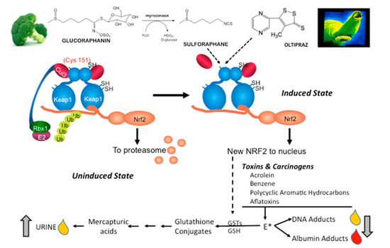 In a study in which smokers were administered phenethyl isothiocyanate (PEITC), the PEITC arm reduced metabolic activation of NNK, one of the most potent lung carcinogens present in cigarettes [232]. Larger increases in rates of excretion of detoxification metabolites (often mercapturic acids) of combustion pollutants such as benzene and aldehydes were observed following PEITC intervention [232]. The mechanisms of action of the two isothiocyanates, SFN and PEITC, are not identical, but do include Nrf2 activation. In a small trial, subjects ingested 250 g each of Brussels sprouts and broccoli per day [233]. At the end of this feeding phase, subjects consumed a cooked meat meal with measured levels of 2-amino-1-methyl-6-phenylimidazo[4,5-b]pyridine (PhIP), a heterocyclic amine carcinogen formed from char-broiling meats) and urine samples were collected. Cruciferous vegetable consumption significantly increased hepatic CYP1A2, as demonstrated by changes in saliva caffeine kinetics. and significantly increased the urinary excretion of N2-hydroxy-PhIP-N2-glucuronide, another possible detoxication outcome through NRF2 induction in humans.