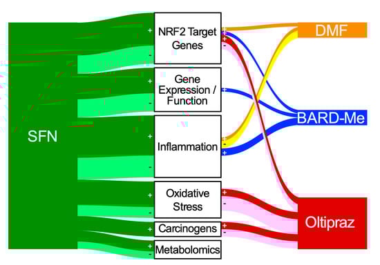Sankey diagram of mechanism-based biomarkers measured in clinical trials for SFN (green), DMF (orange), BARD-Me (blue), and oltipraz (red). Darker lines (green, orange, blue, red) marked with “+” are studies in which at least 1 biomarker was reported to exhibit a statistically significant (p < 0.05) change. Lighter lines marked with “-“ indicate nonsignificant (i.e., null) responses for all biomarkers examined within a study. This accounting overemphasizes positive outcomes. Lines emanating from each inducer are connected to different measured biomarker categories. The box height for each NRF2 inducer and the thickness of the flow lines or nodes emanating from each inducer to the biomarker categories are proportional to the number of biomarker category counts.