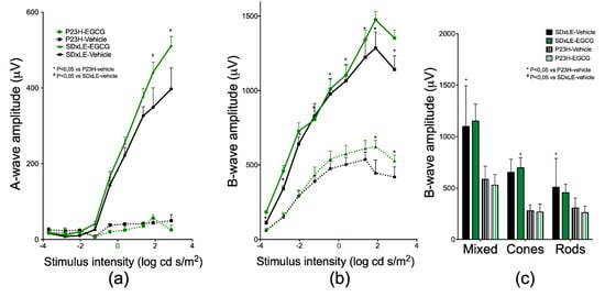 - Pinilla, I.; Lund, R.D.; Sauve, Y. Contribution of rod and cone pathways to the dark-adapted electroretinogram (ERG) b-wave following retinal degeneration in RCS rats. Vis. Res. 2004, 44, 2467–2474. [Google Scholar] [CrossRef][Green Version]