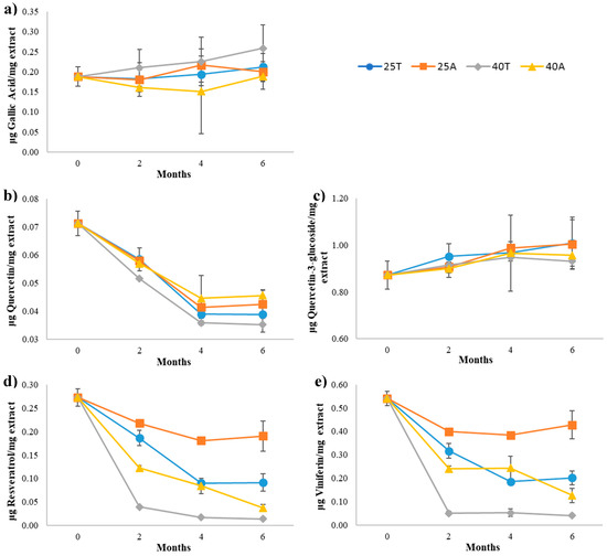 Concentration of gallic acid (a), quercetin (b), a quercetin derivative (c), resveratrol (d) and viniferin (e) during storage under different conservation conditions over 6 months. Here, 25T, samples conserved at 25 °C in transparent vials; 25A, samples conserved at 25 °C in amber vials; 40T, samples conserved at 40 °C in transparent vials; 40A, samples conserved at 40 °C in amber vials.