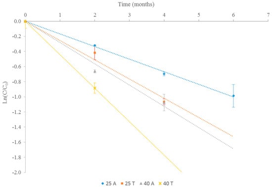 Anthocyanin degradation kinetic at different conservation conditions: ◆: 25 °C in amber vial (25A); ■: 25 °C in transparent vial (25T); ▲: 40 °C in amber vial (40A); ×: 40 °C in transparent vial (40T).