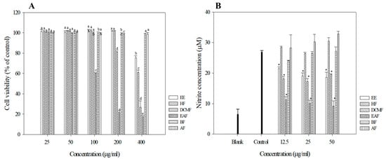 Cell viabilities of R crispus extracts and solvent fractions. (A) NO production (B) in Raw 264.7 cells. RAW 264.7 cells were treated with various concentrations (25, 50, 100, 200, 400 μg/mL) of R. crispus extracts and fractions for 24 h. Cell viability was measured by MTT assay. RAW 264.7 cells were pre-incubated with 12.5, 25, and 50 μg/mL of extracts and fractions for 1 h and then treated with 1 μg/mL of LPS for 24 h. The NO production was measured by the Griess reagent system. Data are represented as means ± SEMs. The different superscripts are significantly different at p < 0.05. * Statistical significance of the difference between LPS and LPS + sample treatment groups: * p < 0.05.