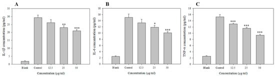 Cytokines play a pivotal role in inflammatory responses by directly affecting the proliferation and activity of immune cells []. Among the pro-inflammatory cytokines, TNF-α is an essential mediator in the development of systemic inflammatory responses, and its synthesis is increased by NO generated by LPS-stimulated macrophages. TNF-α increases the expressions of chemokines and cell adhesion molecules, thereby accelerating pro-inflammatory responses []. IL-1β and IL-6 are multifunctional cytokines secreted by macrophages activated by various pro-inflammatory stimuli; these cytokines are also implicated in the induction of autoimmune diseases, and they act by accelerating inflammatory responses through autocrine signaling []. Figure 2 shows the inhibition of IL-1β, IL-6, and TNF-α secretion following EAF treatment using the enzyme-linked immunosorbent assay (ELISA). The secretion of pro-inflammatory cytokines by Raw 264.7 cells was sharply increased following LPS stimulation and decreased after treatment with EAF in a concentration-dependent manner. IL-1β, IL-6, and TNF-α were suppressed by 28%, 65%, and 68%, respectively, when treated with 50 μg/mL EAF.