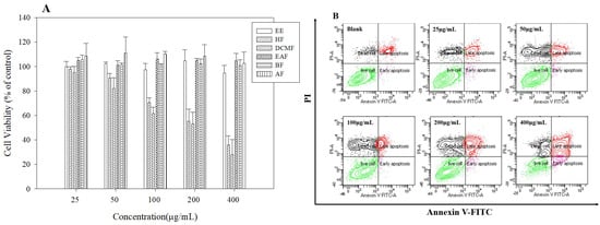 Cell viability of R crispus extracts and solvent fractions. (A) apoptosis induced (B) in HepG2 cells. HepG2 cells were treated with various concentrations (25, 50, 100, 200, 400 μg/mL) of R. crispus extracts and fractions for 24 h. Cell viability was measured by MTT assay. Flow cytometry analysis of apoptosis after exposure to various concentrations (25, 50, 100, 200, 400 μg/mL) of DCMF for 24 h, using annexin V-FITC/PI. The lower right indicates the percentage of early apoptotic cells; the upper right indicates the percentage of necrotic and late apoptotic cells.