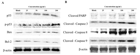 The same amounts of cell lysates were analyzed on 10% SDS-PAGE and the proteins were blotted onto immuno-blot nitro-cellulose membranes and blocked with 5% BSA in TBS containing 0.1% Tween 20 (TBS-T) for 1 h. Then the primary monoclonal antibodies were added to the TBS-T (1:1000 dilutions) and incubated overnight. Antibody binding was detected using a horseradish peroxidase secondary antibody and enhanced using a chemi-luminescence ECL assay kit (Bio-Rad, Hercules, CA, USA) according to the manufacturer’s instructions and imaged on a FUJIFILM LAS-4000 mini system (Tokyo, Japan). The basal levels of the proteins were normalized against β-actin or β-tubulin.