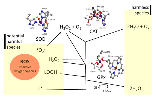 Chemical transformations of some of the reactive oxygen species (ROS) from potentially harmful species (superoxide radical, O2•−; hydrogen peroxide, H2O2; lipid hydroperoxides, LOOH; or lipid radicals, L•) into harmless species through manganese antioxidant enzymes: the figure shows the core of the active site of human mitochondrial SOD2, the core of the active site in Lactobacillus plantarum catalase (CAT), and the core of the active site of manganese glutathione peroxidase (GPx). W = water; GSH = monomeric glutathione; GSSG = glutathione disulfide.