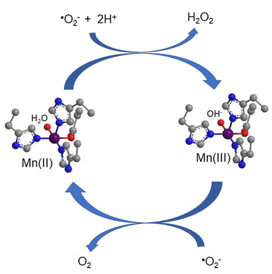 One of the most interesting properties of the manganosalen complexes is that they are cell-permeable, with better bioavailability than exogenous antioxidant enzymes [90,91]. Manganosalen complexes exhibit high SOD, catalase, and peroxidase activities, which has led to their development as catalytic antioxidants [6,7,8,9,10,13,18,19,20,21,23], a term used for all cases in which one single molecule of catalyst induces the detoxification of numerous ROS molecules.