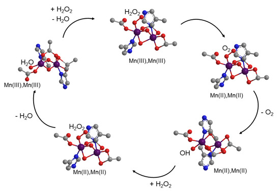 Hydrogen peroxide is generated as a by-product of mitochondrial electron transport of aerobic respiration. As it has been mentioned, it is one of the products of the superoxide radical anion dismutation by SOD. Although H2O2 is less reactive than superoxide, control of H2O2 levels is also critical [48]. Catalase enzymes catalyze the decomposition of hydrogen peroxide to water and oxygen [49]. The non-heme dinuclear Mn catalase was isolated from bacteria. Figure 1 shows the core of the active site of this enzyme in Lactobacillus plantarum [50]. The catalase reaction proceeds via a two-electron oxidation-reduction cycle during turnover (Figure 3).