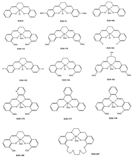 Structures of some manganosalen complexes, corresponding to the EUK series, with pharmacological relevance.