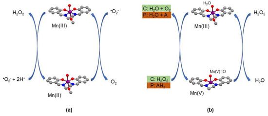 Malfroy et al. first reported the SOD mimetic properties of manganosalen complexes [92]. Based on stopped-flow analysis combined with time-resolved UV/vis spectroscopy and global spectra analysis of superoxide decay, it has been reported that manganosalen complexes possess a SOD activity of about 2 × 106 M−1 s−1 [93,94], both in Hepes and in phosphate buffers. The mechanism followed by the manganosalen complexes is similar to that of the native SOD enzyme, a ping-pong mechanism where a superoxide anion radical reduces the synthetic manganese complex from Mn(III) to Mn(II), which is subsequently oxidizes back to Mn(III) by a second superoxide anion radical (Figure 7a) [10,19,23].